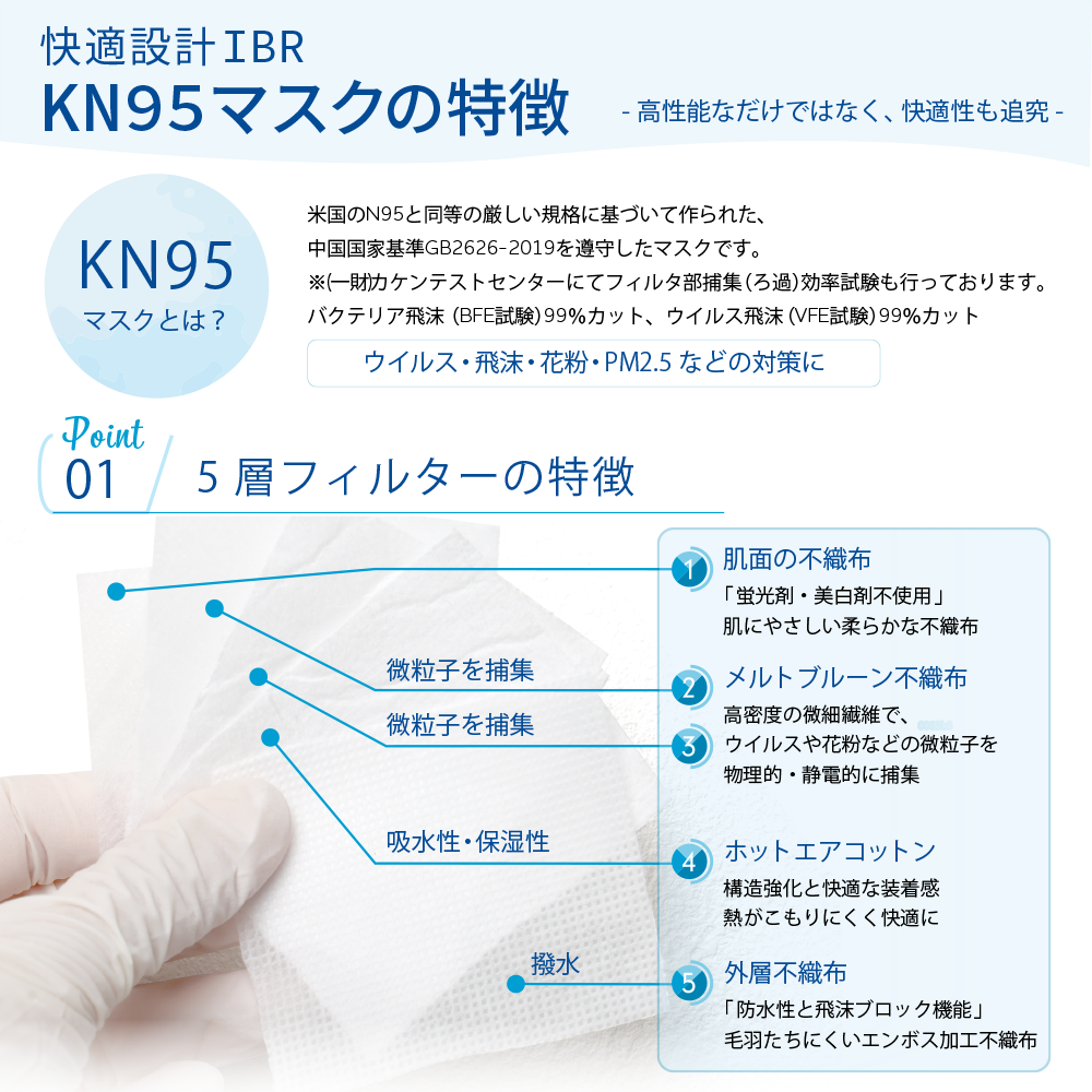 アイビーアールのKN95立体構造マスクは、飛沫をブロックするだけではなく、高い実用性がございます。